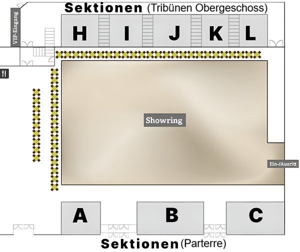 Die VIP-Tische befinden sich – wie am Saalplan ersichtlich – in Premiumposition direkt rund um den Showring und bieten Ihnen somit beste Sicht und Nähe zur Show.