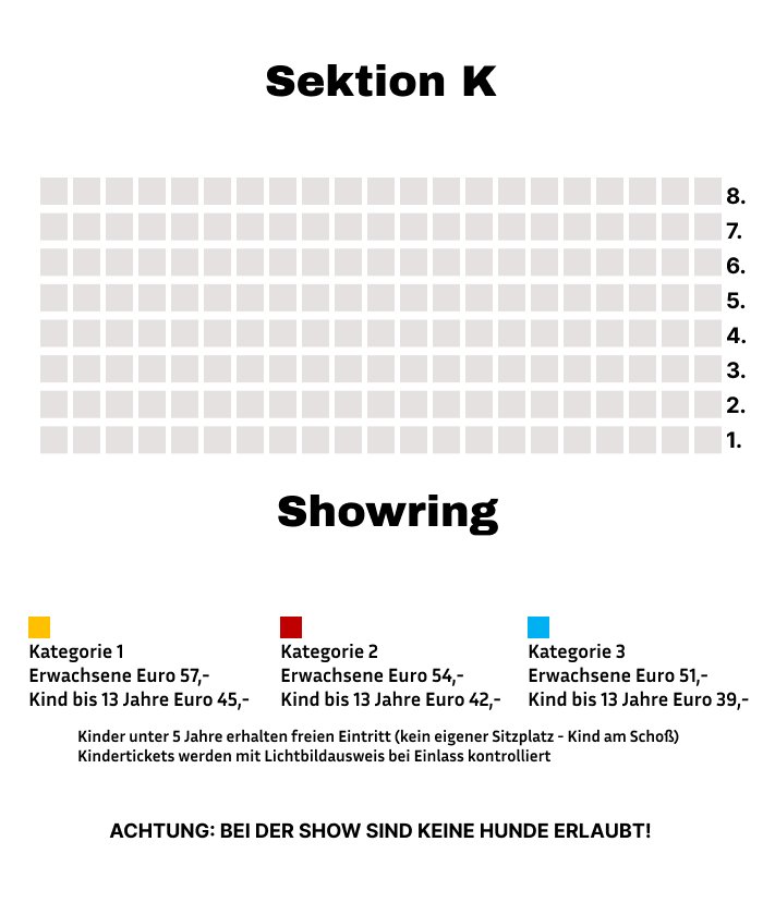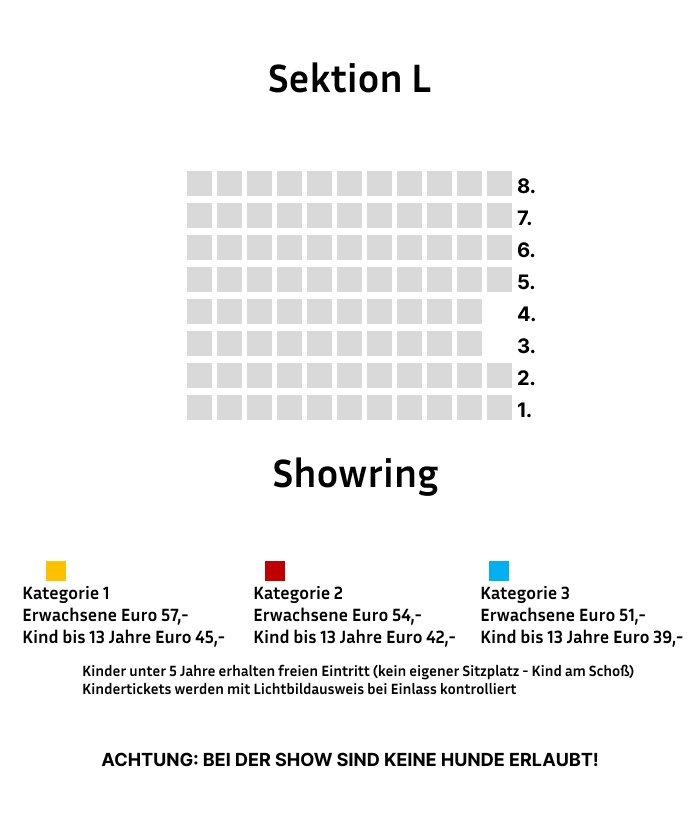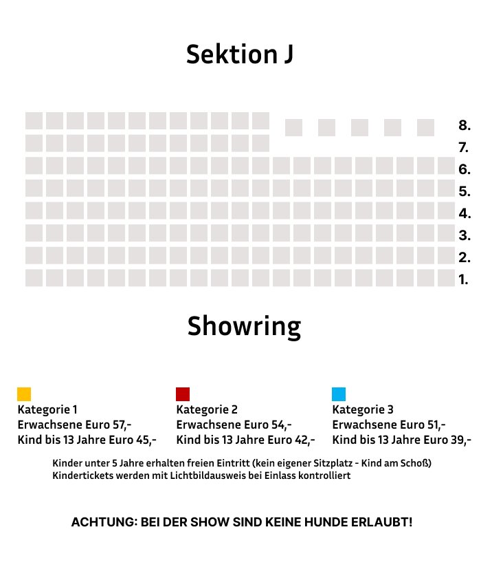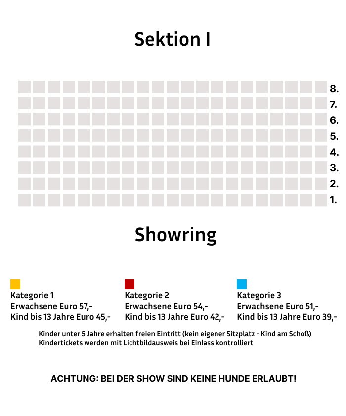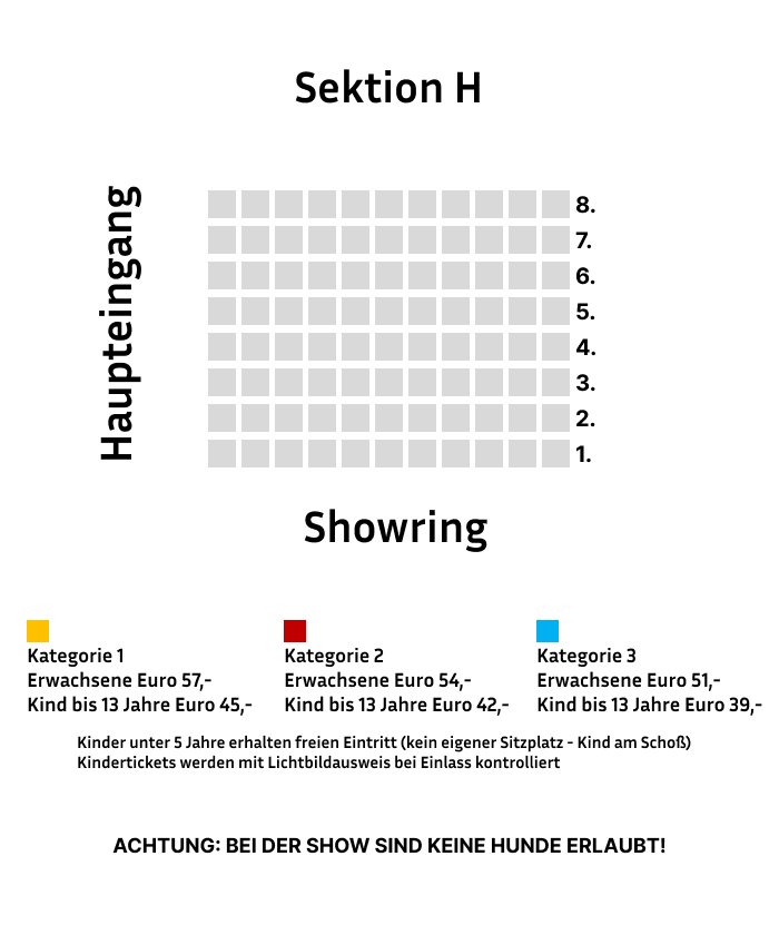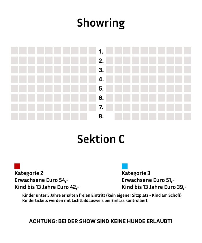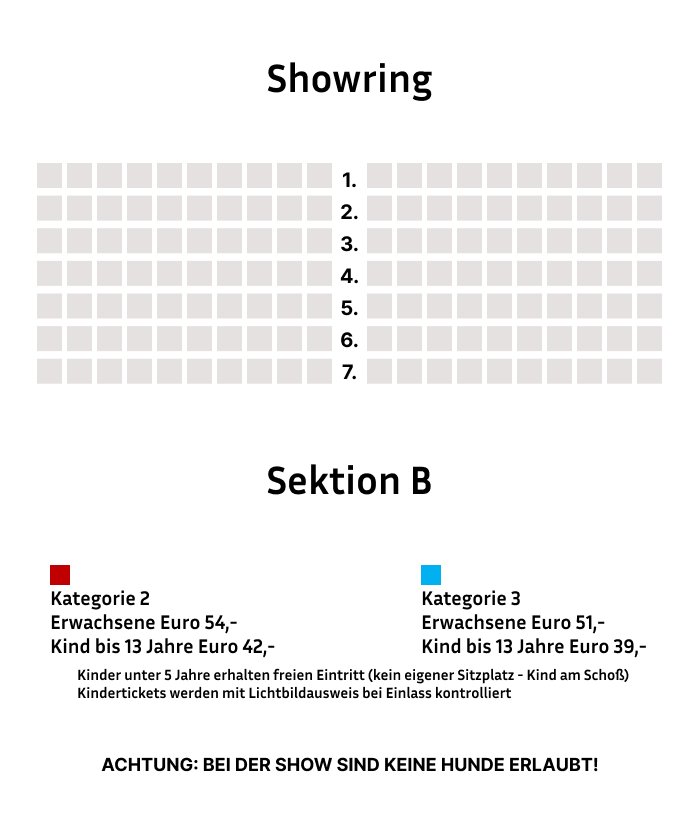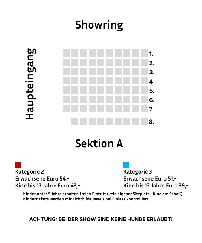 Die VIP-Tische befinden sich – wie am Saalplan ersichtlich – in Premiumposition direkt rund um den Showring und bieten Ihnen somit beste Sicht und Nähe zur Show.